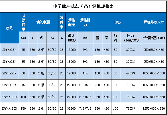 別的還有便是點焊機與電焊機的工藝流程不一樣,點焊的工藝進程為注冊冷卻水;將焊件外表整理干凈,安裝精確后,送入上、下電極之間,施加壓力,使其觸摸良好;通電使兩工件觸摸外表受熱,部分熔化,構成熔核;斷電后保持壓力,使熔核在壓力下冷卻凝結構成焊點;去除壓力,取出工件。焊接電流、電極壓力、通電時間及電極作業外表尺寸等點焊工藝參數對焊接質量有嚴重影響