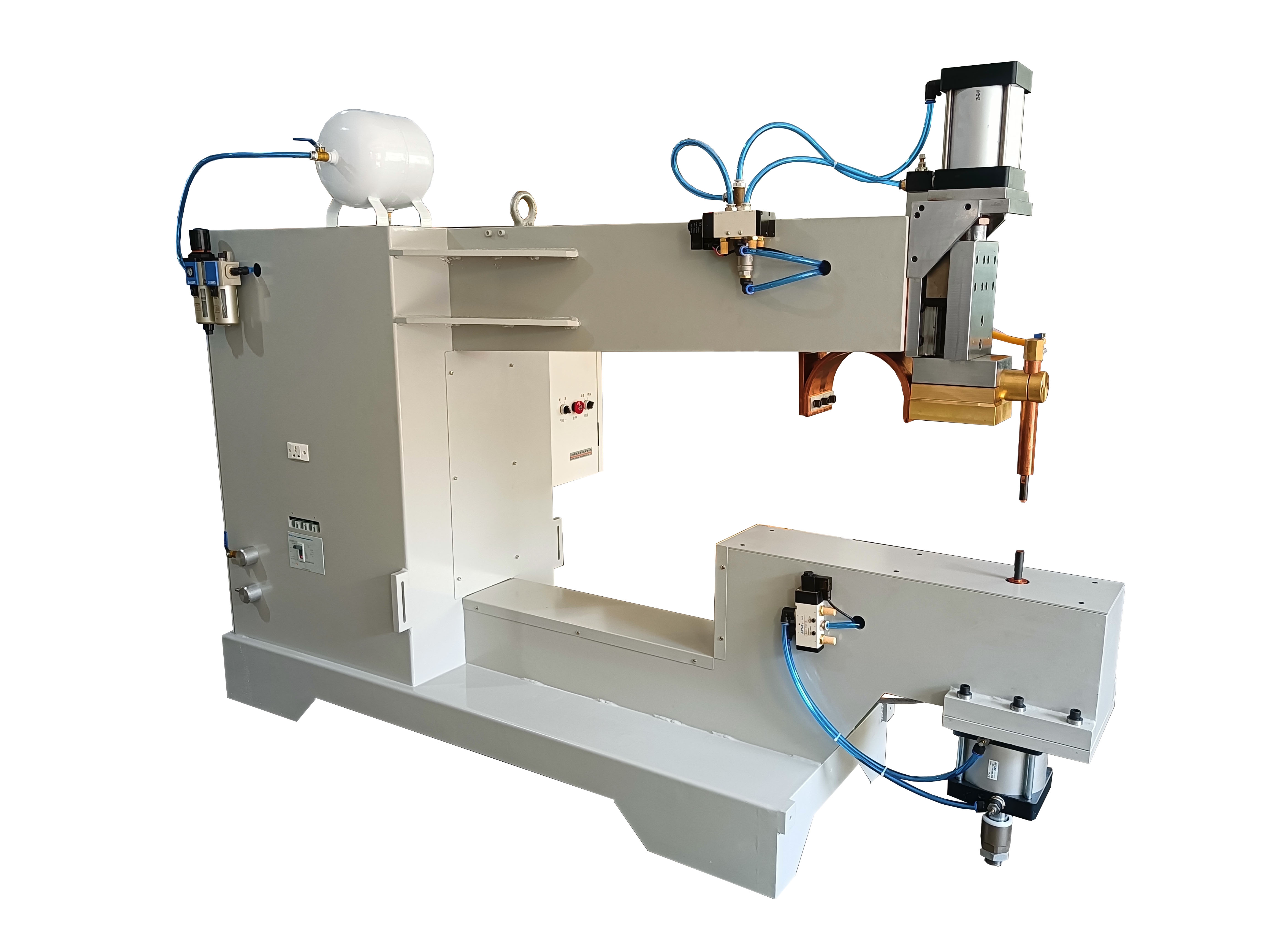一體式懸掛點焊機由焊鉗、變壓器、水冷系統、氣動加壓系統、懸掛裝置等部分組成,按照焊臂動作分為兩種,X型鉗和C型鉗。X型一體式懸掛焊機。